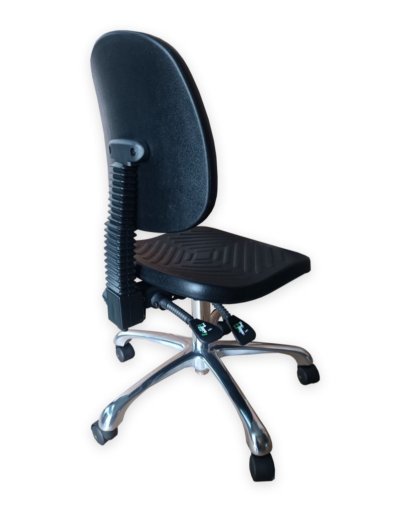 Pracovní židle se sedákem a opěrákem z PUR pěny splňující normy pro antistatické prostředí s robustním křížem z hliníku a nosností 130 kg.