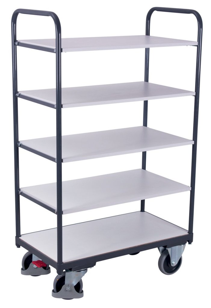 Policový antistatický vozík. Ocelová konstrukce, ložná plocha z dřevotřísky - světle šedá. Povrchová úprava práškovým lakem RAL 7024 tmavě šedá, odolná vůči nárazům a poškrábání. Antistatická kolečka s kuličkovým ložiskem, 2 otočná s centrální brzdou Easy Stop, 2 pevná. Rozměr výška 1530 x šířka 1060 x hloubka 700 mm.