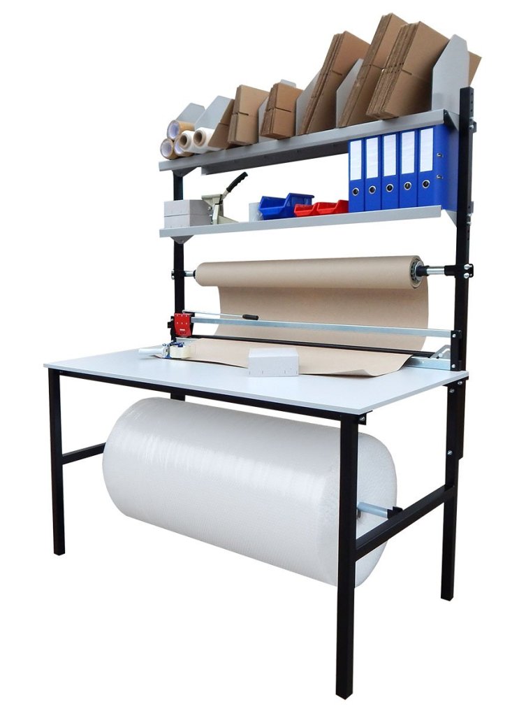 Univerzální balící stůl pro kompletaci a expedici zásilek v balicích centrech. Rozměry výška 2220 x šířka 980 x délka 1425 mm. Barva desky šedá, barva konstrukce černá.