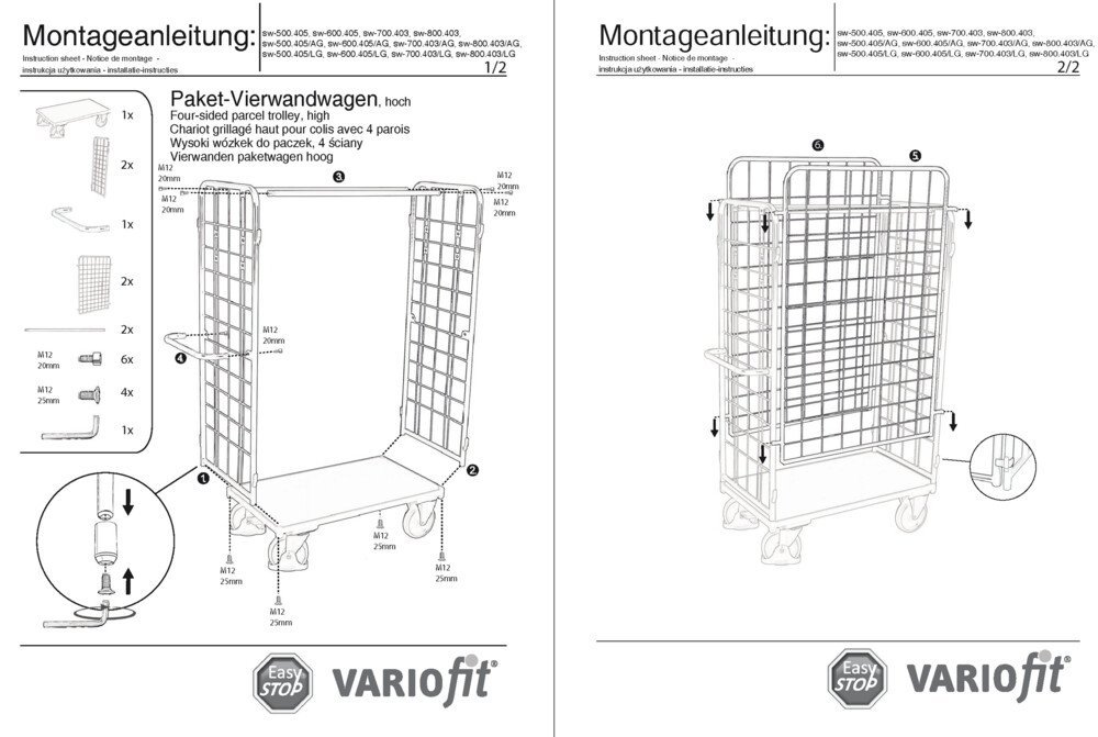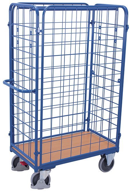 Balíkový vozík čtyřstěnný, ocelová konstrukce, drátěné bočnice a stěny s velikostí ok 120 x 120 mm. Ložná plocha z tvrdého materiálu na bázi dřeva. Podélné stěny odnímatelné. Vysoce odolná termoplastická kolečka, 2 otočná s centrální brzdou Easy Stop a 2 pevná.