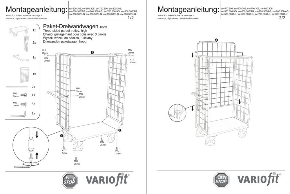 Balíkový vozík třístěnný, ocelová konstrukce, drátěné bočnice a zadní stěna s velikostí ok 120 x 120 mm. Ložná plocha z tvrdého materiálu na bázi dřeva. Podélná stěna odnímatelná. Vysoce odolná termoplastická kolečka, 2 otočná s centrální brzdou Easy Stop a 2 pevná.