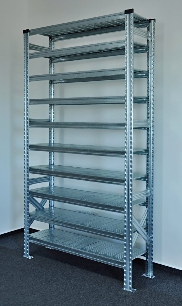 Bezšroubový policový regál. 10x police, nosnost 125 kg. Rozměry v. 1972 x š. 1124 x h. 330 mm.