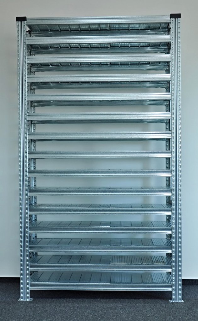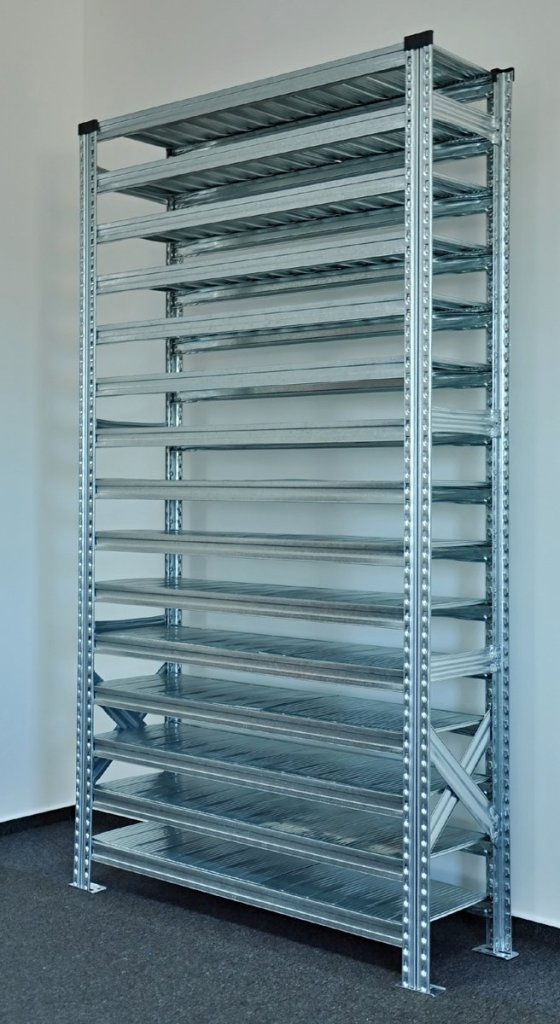 Bezšroubový policový regál. 15x police, nosnost 125 kg. Rozměry v. 1972 x š. 1124 x h. 330 mm.