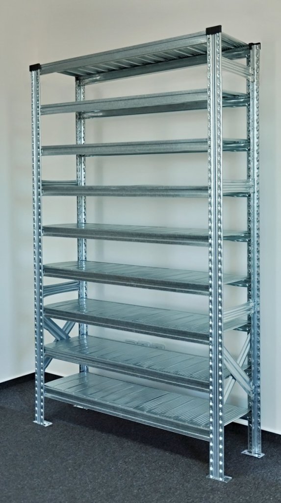 Bezšroubový policový regál. 9x police, nosnost 125 kg. Rozměry v. 1972 x š. 1124 x h. 410 mm. celý popis a parametry