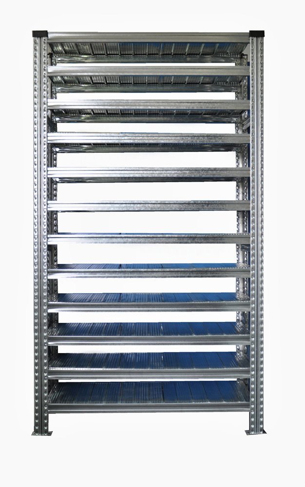 Bezšroubový policový regál. 12x police, nosnost 125 kg. Rozměry v. 1972 x š. 1124 x h. 510 mm.