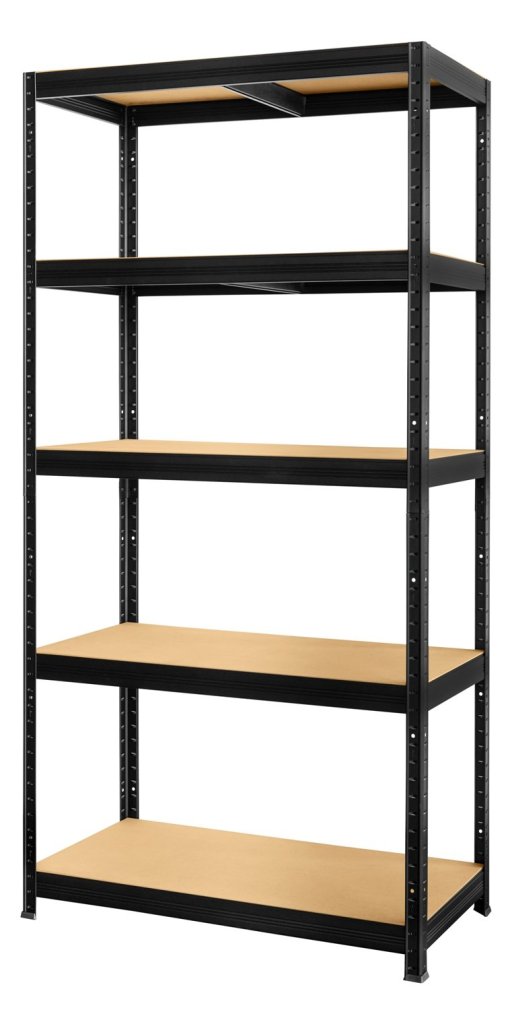 Univerzální policový regál, bezšroubový montážní systém. Výška regálu 1800 x šířka 1200 x hloubka 600 mm, 5x police s výztuhou, nosnost 250 kg. Provedení v černé barvě.