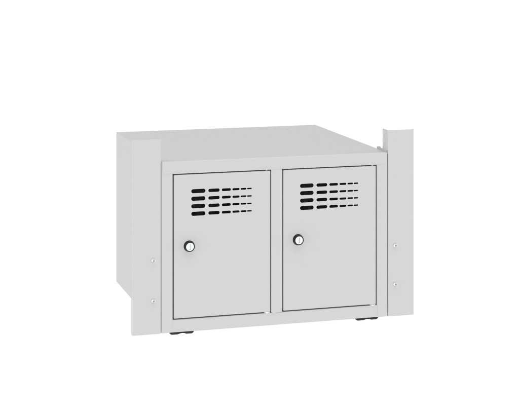 Lavice s nohami s rektifikací. Rozměry: výška 390 x šířka 590 x hloubka 745 mm. Barevné provedení nohou v barvě korpusu. Deska šedý plast.