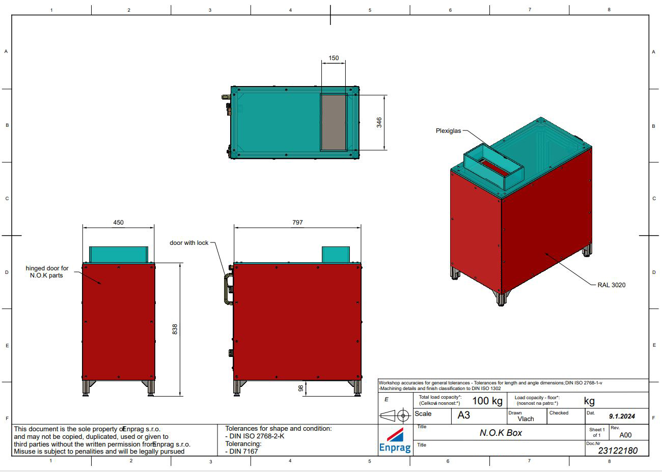 Box vhodný pro skladování NOK (Not Okay) součástek. Robustní a kvalitní konstrukce zajistí nejen bezpečné uložení, ale i přepravu NOK součástek. Horní část konstrukce je vyrobena z průhledného plexiskla, které umožňuje snadné monitorování obsahu, a je vybavena otvorem pro snadné vhození součástek. Základní konstrukce je tvořena z hliníkových profilů.