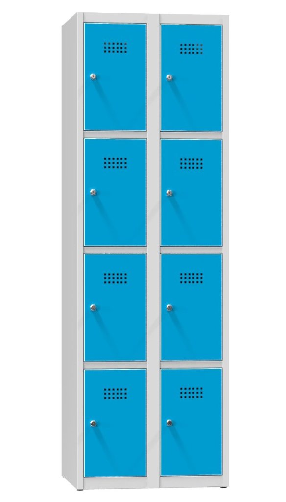 Skříň kovová s osmi uzamykatelnými schránkami šířka 600, výška 1850, hloubka 500 mm. Šířka každého oddělení 300 mm, možnost náhrady zámku uzávěrem pro visací zámek nebo mincovním zámkem. Barva korpusu RAL 7035 světle šedá.