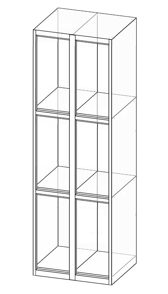 Skříň s uzamykatelnými boxy, výška 1850 x šířka 300 x hloubka 500 mm, cylindrický zámek s jednoduchou závorou nebo uzávěr pro visací zámek. Větrací otvory ve dvířkách, světlost boxu na výšku 300 mm, průchozí šířka šatní buňky 250 mm.