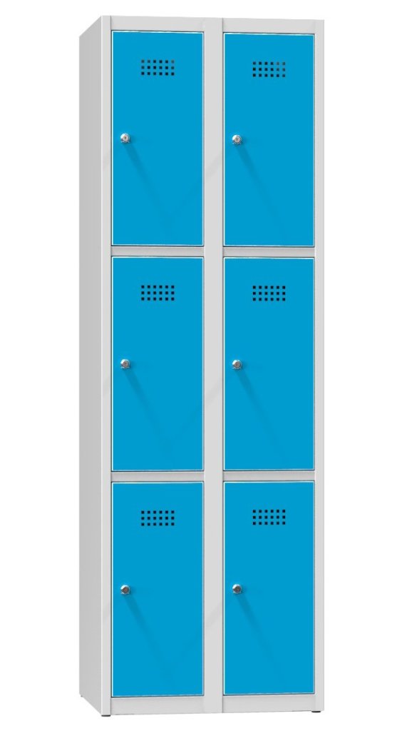 Skříň s uzamykatelnými boxy, výška 1850 x šířka 600 x hloubka 500 mm, cylindrický zámek s jednoduchou závorou nebo uzávěr pro visací zámek. Větrací otvory ve dvířkách, světlost boxu na výšku 540 mm, průchozí šířka šatní buňky 250 mm.