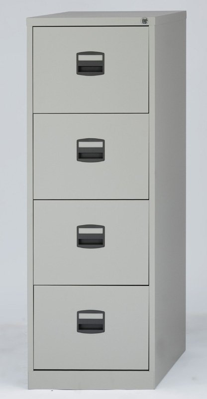 Čtyřzásuvkové kovové kartotéky pro dokumenty nebo závěsné pořadače formátu A4 nebo Foolscap, šířka 413 nebo 470, výška 1321, hloubka 622 mm, centrální zámek, různé barvy.