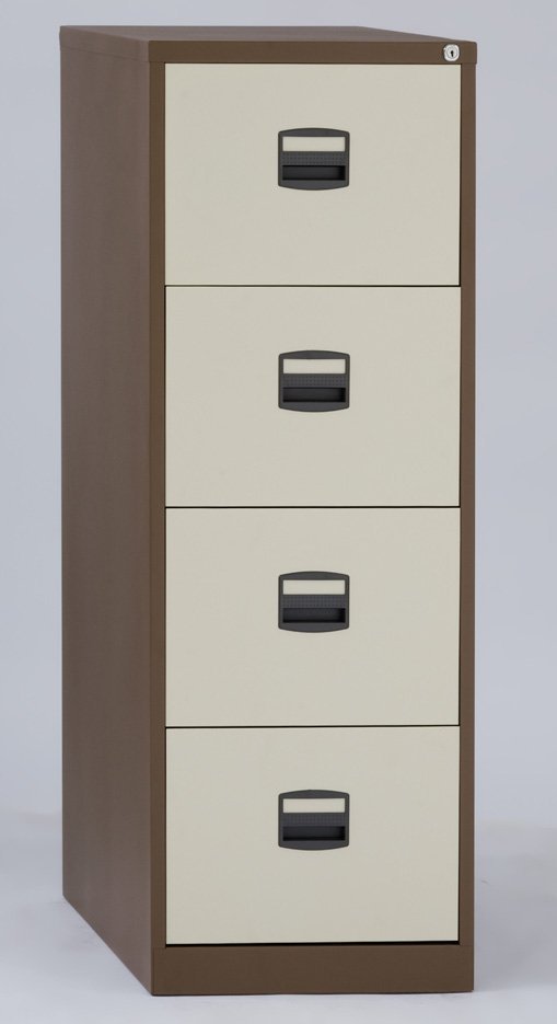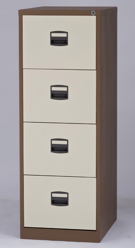 Čtyřzásuvkové kovové kartotéky pro dokumenty nebo závěsné pořadače formátu A4 nebo Foolscap, šířka 413 nebo 470, výška 1321, hloubka 622 mm, centrální zámek, různé barvy.