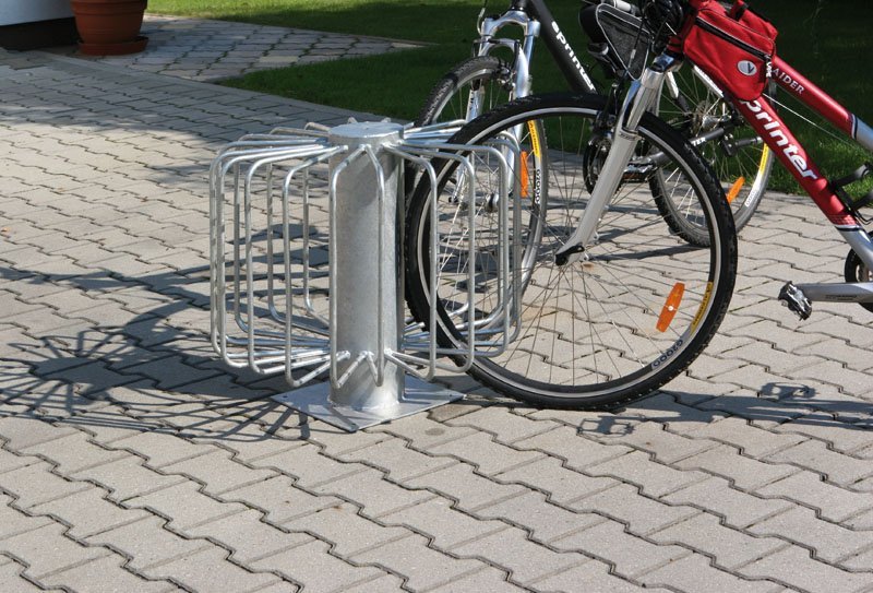 Věšák na kolo. Vyroben z tuhých ocelových profilů. Povrchová ochrana je provedena práškovou barvou v odstínu červeném, je připraven ke kotvení na zeď. Při nepoužívání lze věšák sklopit na zeď k úspoře místa. Složený věšák je pouze 122 mm široký. Rozměry ve sklopeném stavu (v x š x h): 520 x 530 x 530 mm.