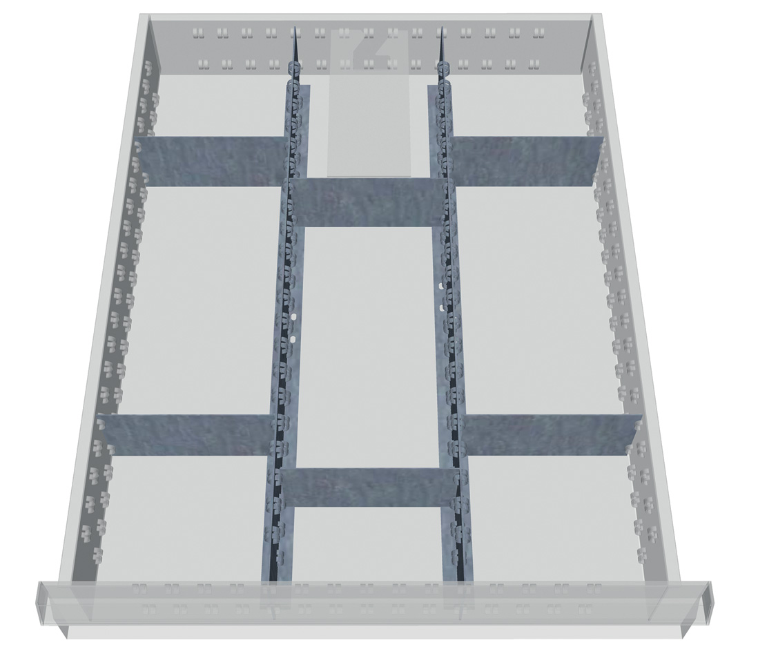 Kovové dělení do zásuvek výšky 150 mm. Vhodné pouze do zásuvkových skříní firmy Bedrunka+Hirth šířky 555 a hloubky 736 mm.