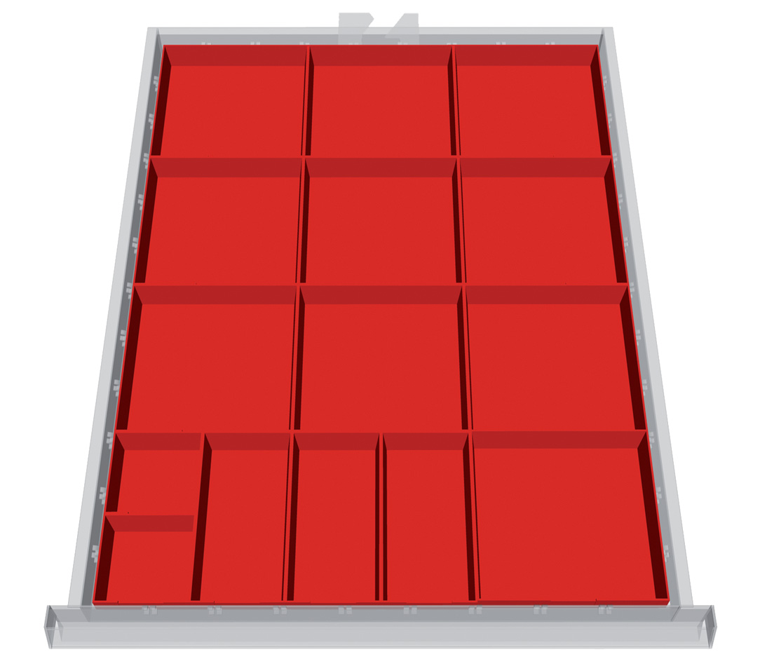 Dělení do zásuvek - set pro 3 zásuvky. Obsahuje 1x gumovou vložku pro zásuvky výšky 50 - 200 mm, 1x plastové dělení pro zásuvky výšky 100 - 150 mm a 1x kovové dělení pro zásuvky výšky 150 mm. Vhodné pouze do zásuvkových skříní firmy Bedrunka+Hirth šířky 555 a hloubky 736 mm.