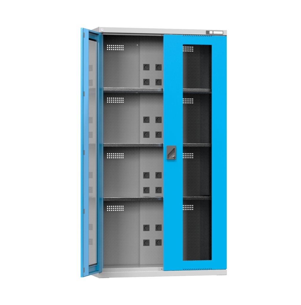 Dílenská dobíjecí skříň NSK2S se skleněnými dveřmi vycházející z konstrukce skříně SK2. Ve skříni je zabudovaný středový panel s celý popis a parametry