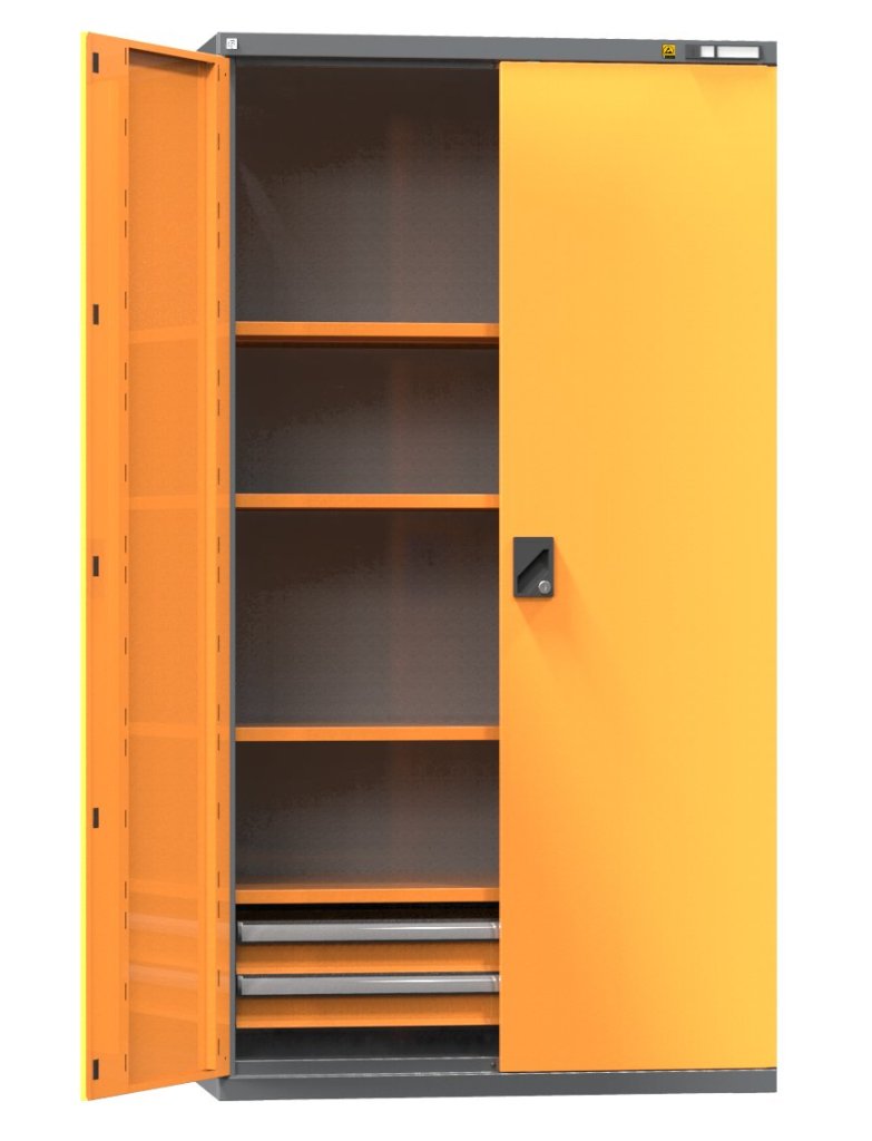 ESD skříň s křídlovými dveřmi, 4x ESD police stavitelná po 25 mm, 2x zásuvka 100E, plná dvířka s výztuhami pro perfo, nosnost 600 kg. Výška 1950 x šířka 1044 x hloubka 655 mm.