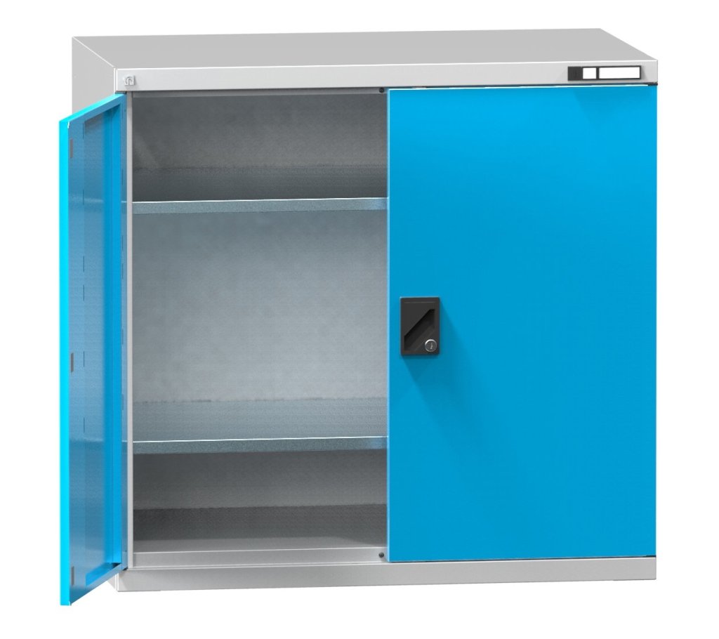Skříň s křídlovými dveřmi, 2x police stavitelná po 25mm (pozink), plná dvířka s výztuhami pro perfo, nosnost 300 kg. Výška 1000 x šířka 1044 x hloubka 655 mm. Skladem v provedení barva korpusu světle šedá RAL 7035, dveří modrá RAL 5012.