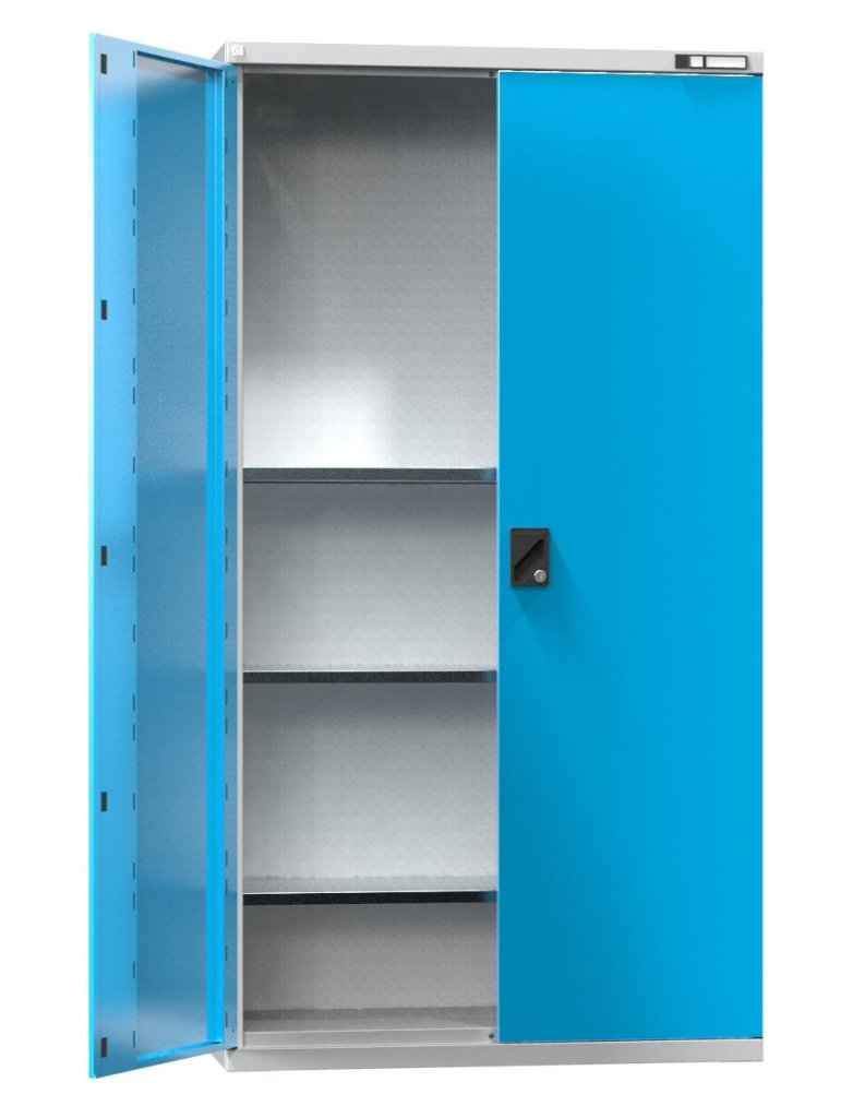 Skříň s křídlovými dveřmi, plná dvířka s výztuhami pro perfo, nosnost 300 kg. Výška 1000 x šířka 1044 x hloubka 405 mm.
