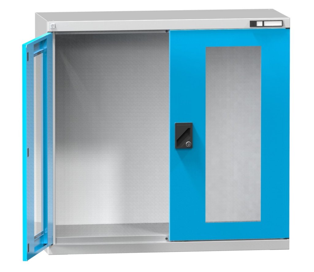 Skříň s křídlovými dveřmi, skleněné dveře v ocelovém rámu, nosnost 300 kg. Výška 1000 x šířka 1044 x hloubka 405 mm.