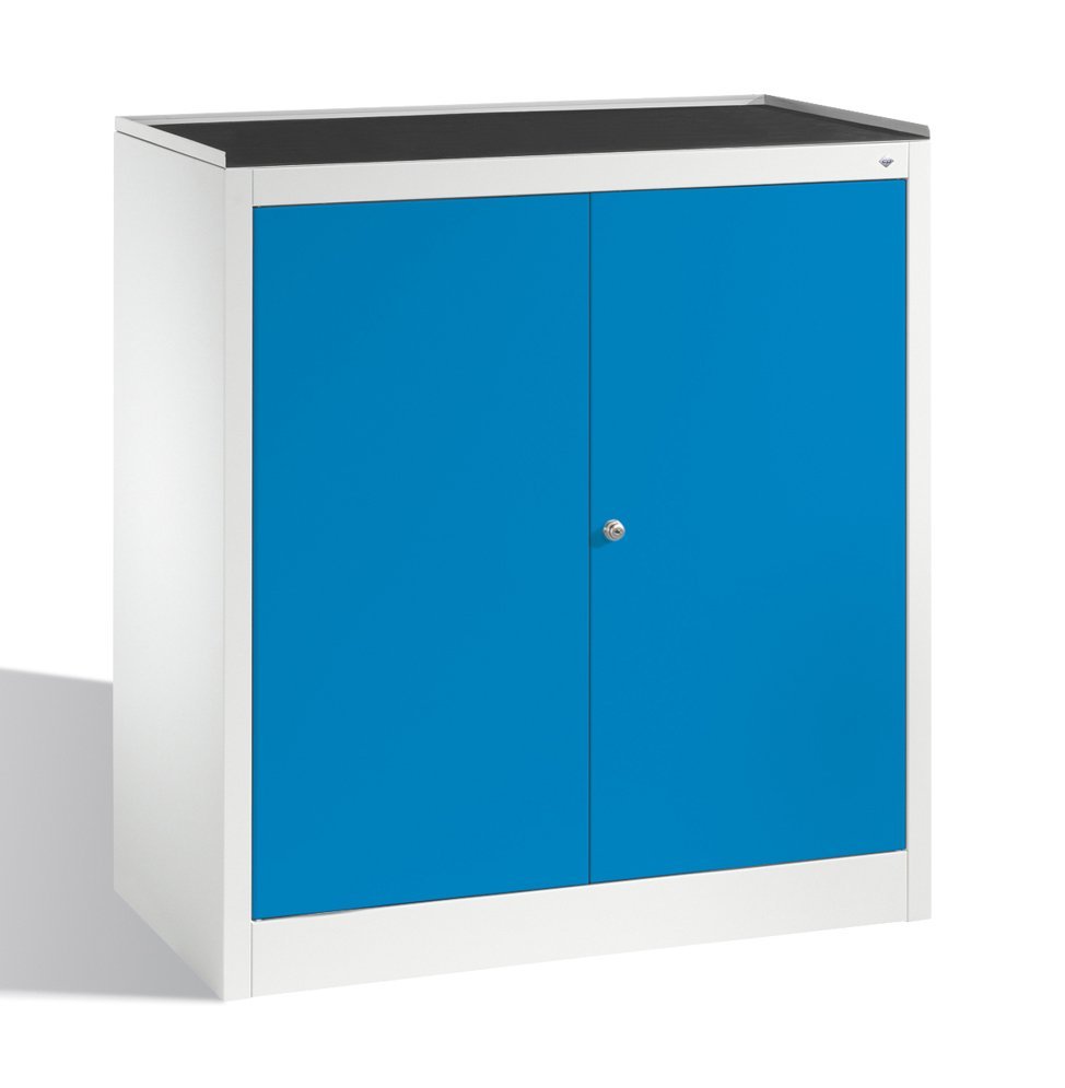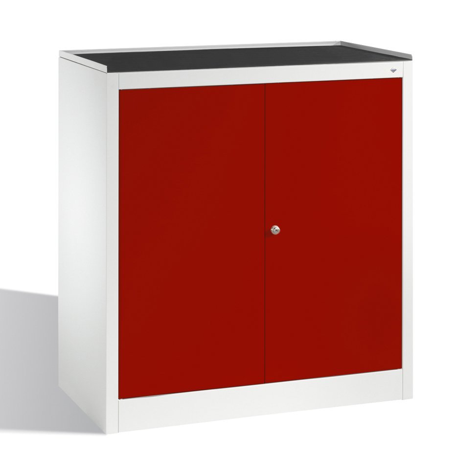 Dvoudveřová dílenská skříňka s odolnou ocelovou konstrukcí. 1x přestavitelná pozinkovaná police, nosnost 70 kg/police. Na horní části skříňky vlnitá gumová podložka. Cylindrický bezpečnostní zámek s rukojetí. Dostupné rozměry v mm (V x Š x H) 1000 x 930/1200 x 500.
