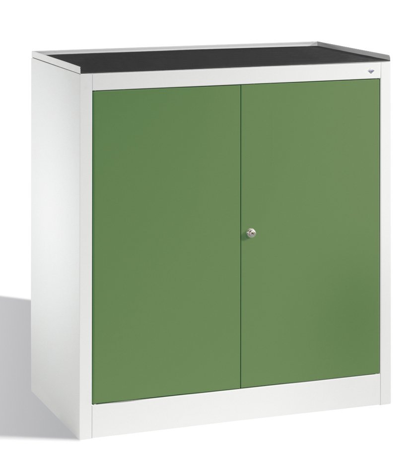 Skříň s křídlovými dveřmi, plná dvířka s výztuhami pro perfo, nosnost 300 kg. Výška 1000 x šířka 1044 x hloubka 405 mm.