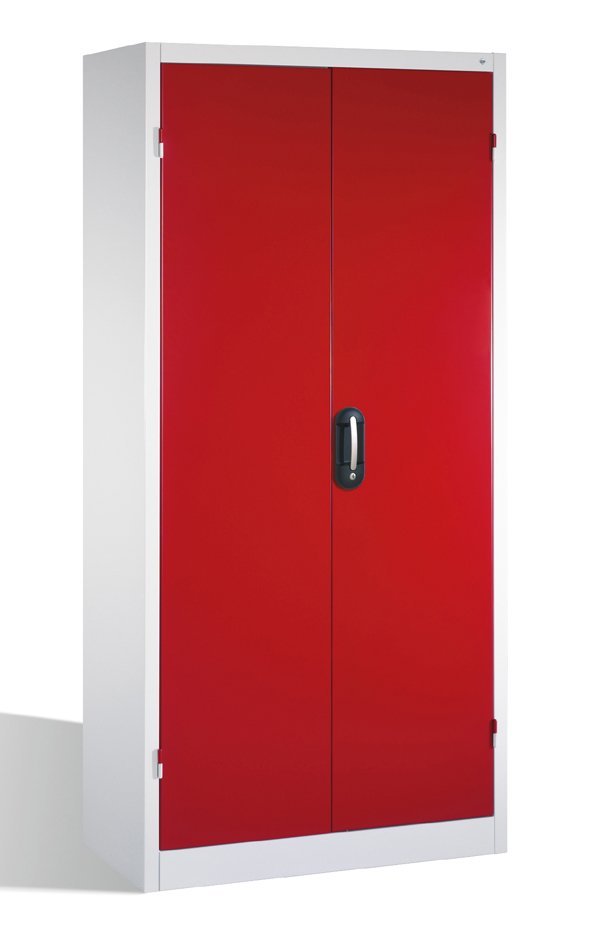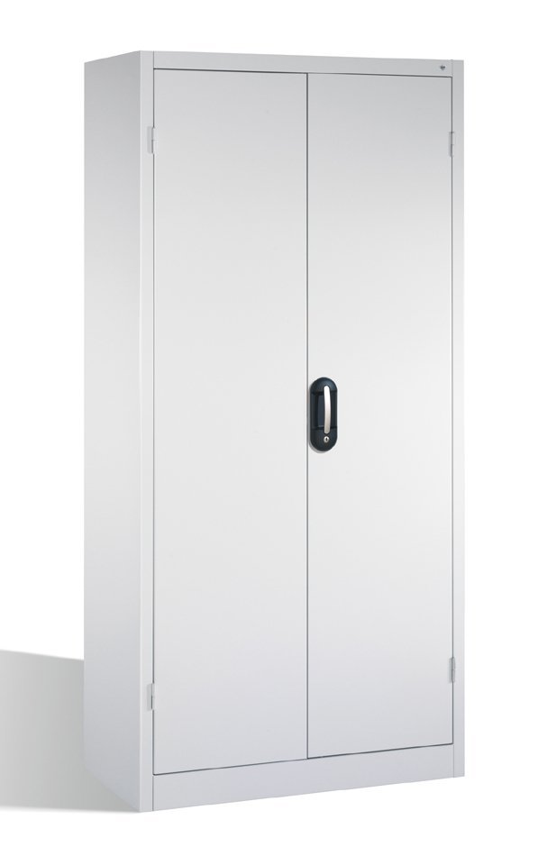 Dvoudveřová kovová skříň se čtyřmi policemi, šířka 950, výška 1950, hloubka 400 mm. Možnost náhrady plných dveří dveřmi se skleněnou výplní, s drátěnou výplní nebo lamino dveřmi v odstínu buk, bříza nebo třešeň. Barva korpusu RAL 7035 světle šedá. Skladem pouze v provedení s ocelovými dveřmi, ostatní varianty na objednávku. Skladem v barvě světle šedé.