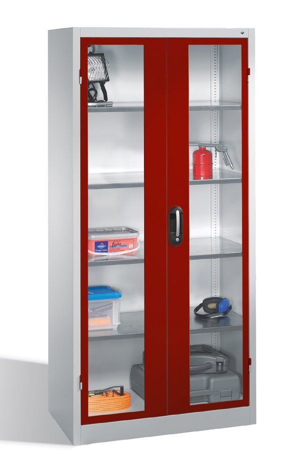 Dílenská skříň s odolnou ocelovou konstrukcí a ocelovými dveřmi s výplní z akrylátového skla. 4x přestavitelná pozinkovaná police, nosnost 70 kg/police. Cylindrický bezpečnostní zámek s rukojetí. Dostupné rozměry v mm (V x Š x H) 1950 x 930/1200 x 500.