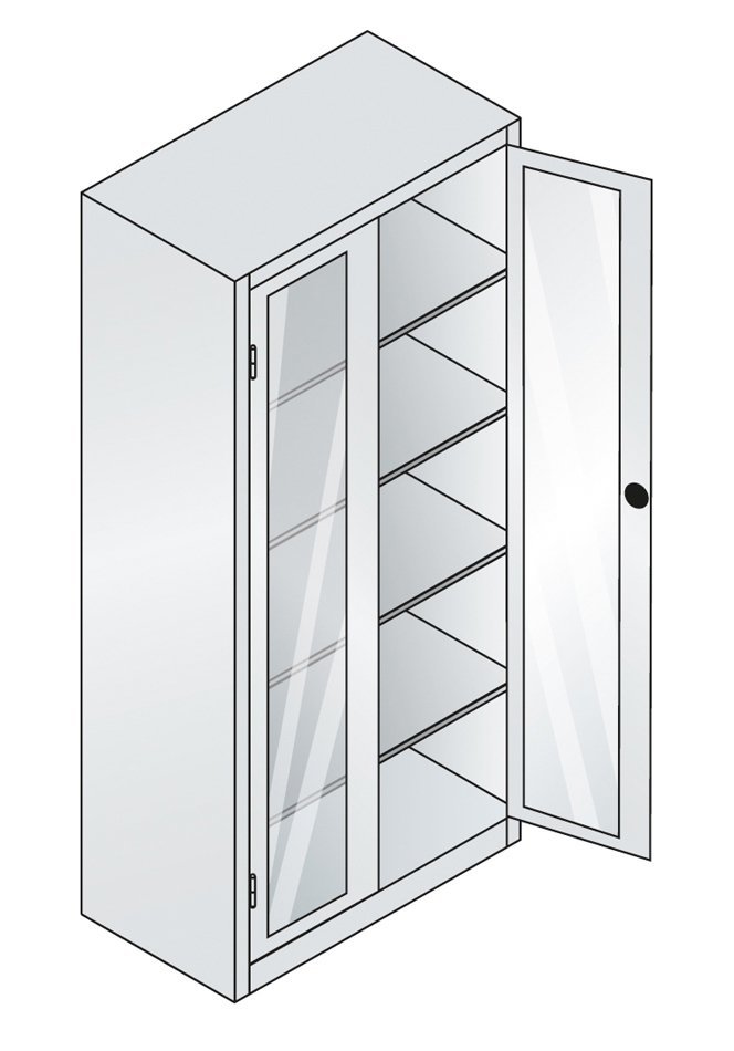 Skříň se skleněnými dveřmi, výška 1150 x šířka 505 x hloubka 400 mm. Zamykání na cylindrický zámek s rozvorovým mechanismem. 2 x stavitelná ocelová police (nosnost 60 kg). Skleněné dveře jsou z tvrzeného skla. Možnost náhrady dveří se skleněnou výplní dveřmi s drátěnou výplní nebo lamino dveřmi v odstínu buk, bříza nebo třešeň. Barva korpusu RAL 7035 světle šedá.