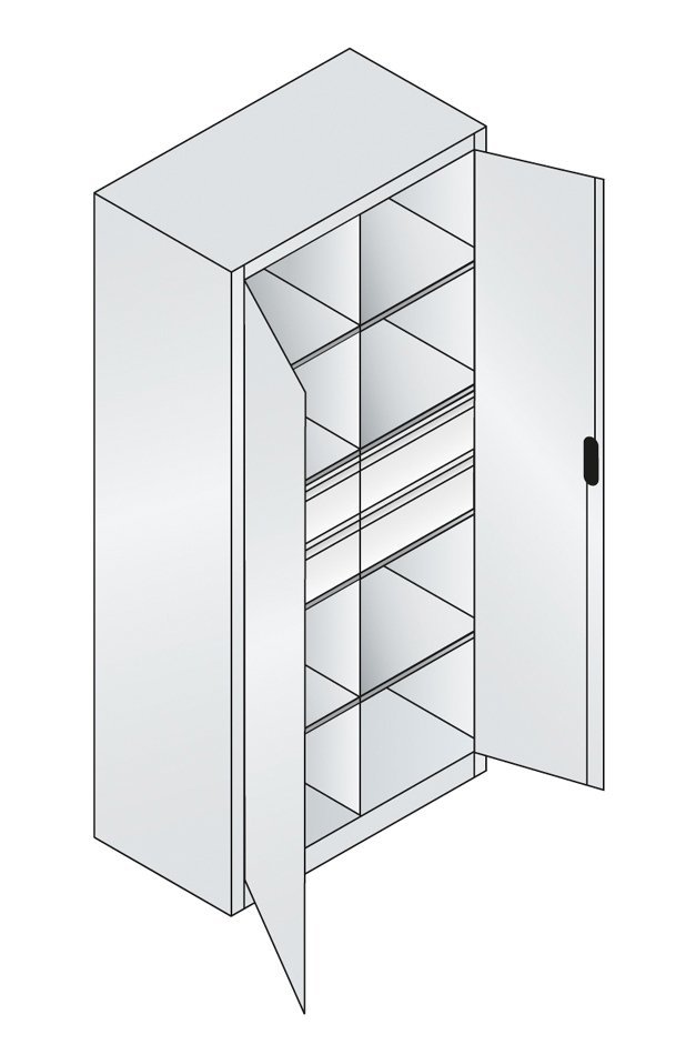 Dvoudveřová dílenská skříň, šířka 950, výška 1950, hloubka 600 mm, 1 police, 8 zásuvek. Možnost náhrady plných dveří dveřmi se skleněnou nebo drátěnou výplní. Barva korpusu RAL 7035 světle šedá.