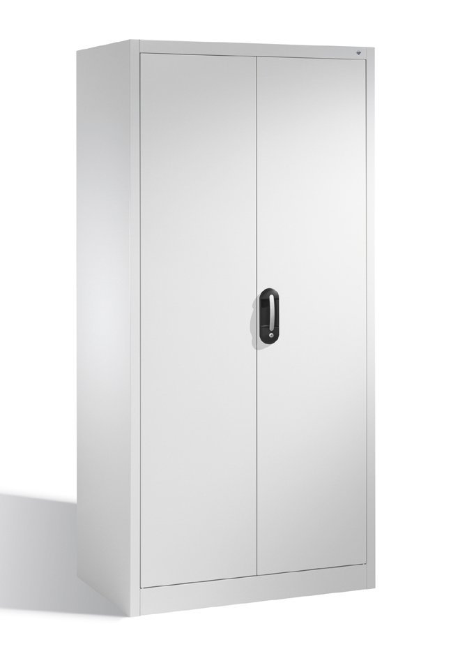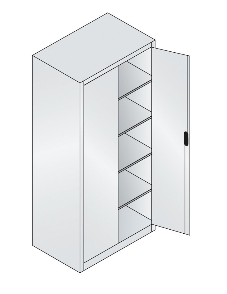 Dvoudveřová dílenská skříň, šířka 950, výška 1950, hloubka 600 mm, 2 police. Možnost náhrady plných dveří dveřmi se skleněnou nebo drátěnou výplní. Barva korpusu RAL 7035 světle šedá.