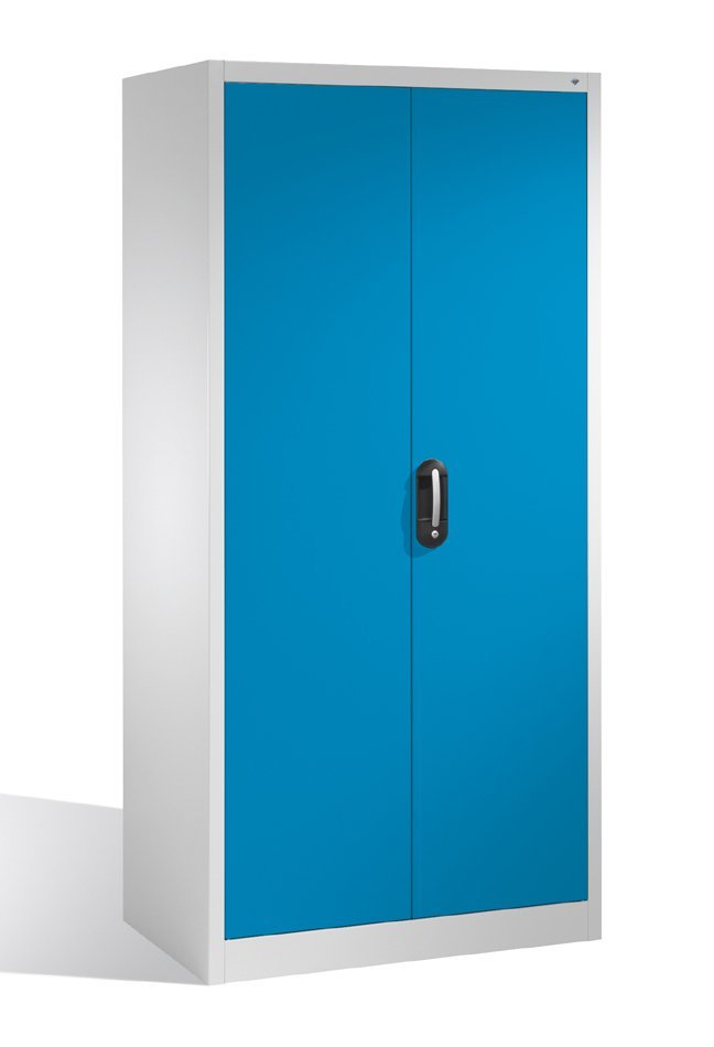 Dvoudveřová dílenská skříň, šířka 950, výška 1950, hloubka 600 mm, 4 police. Možnost náhrady plných dveří dveřmi se skleněnou nebo drátěnou výplní. Barva korpusu šedá RAL 7035. Skladem v barvě dveří modrá RAL 5012.