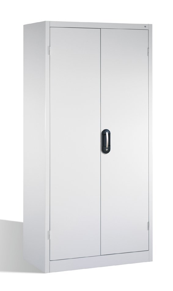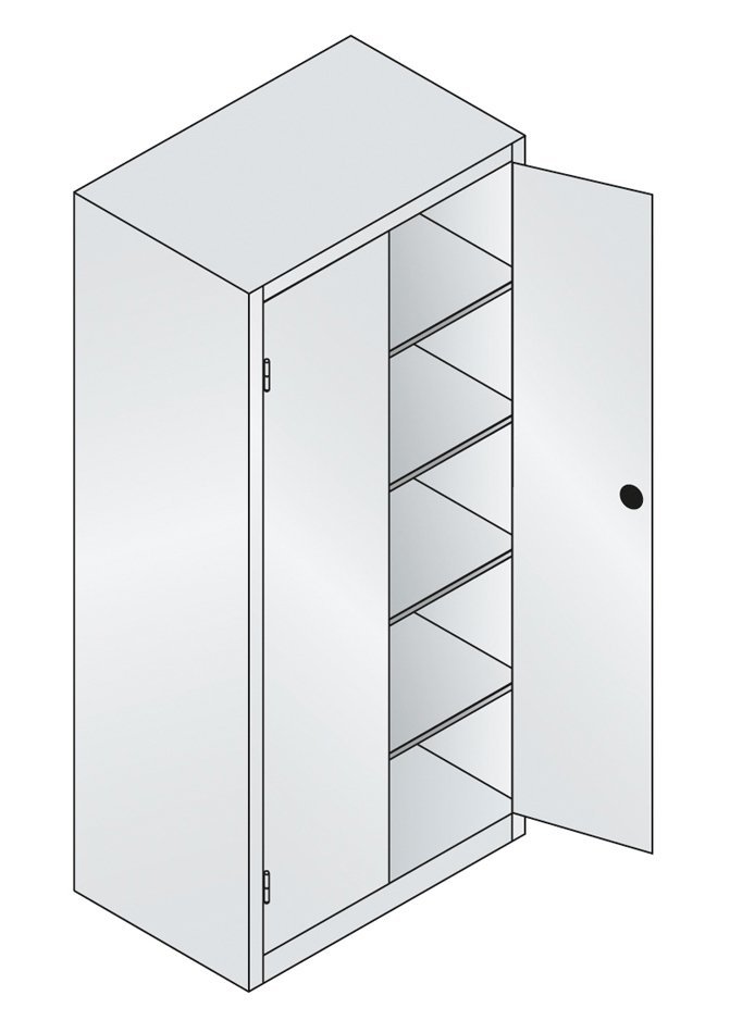 Dvoudveřová kovová skříň se čtyřmi policemi, šířka 950, výška 1950, hloubka 400 mm. Možnost náhrady plných dveří dveřmi se skleněnou výplní, s drátěnou výplní nebo lamino dveřmi v odstínu buk, bříza nebo třešeň. Barva korpusu RAL 7035 světle šedá. Skladem pouze v provedení s ocelovými dveřmi, ostatní varianty na objednávku. Skladem v barvě světle šedé.