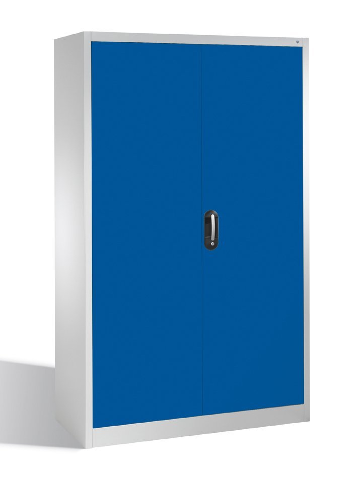 Dvoudveřová dílenská skříň, šířka 950, výška 1950, hloubka 600 mm, 4 police. Možnost náhrady plných dveří dveřmi se skleněnou nebo drátěnou výplní. Barva korpusu šedá RAL 7035. Skladem v barvě dveří modrá RAL 5012.