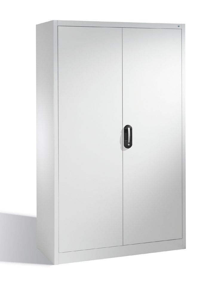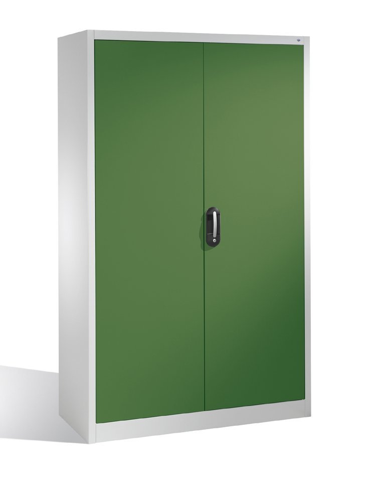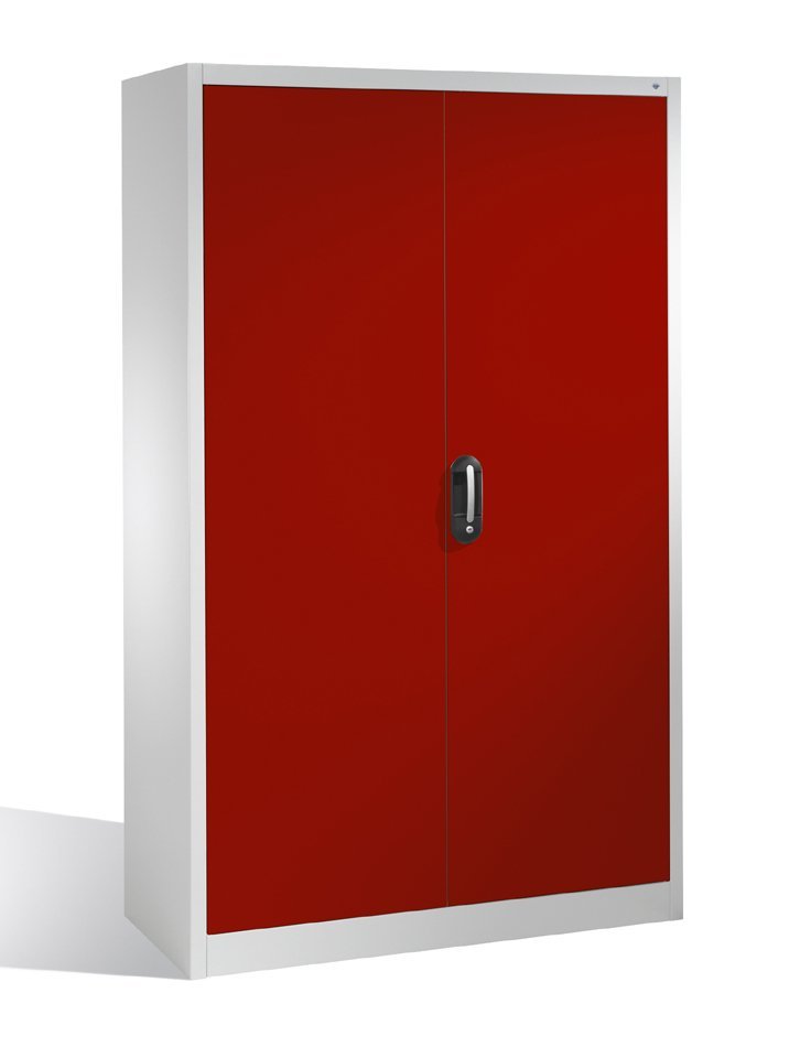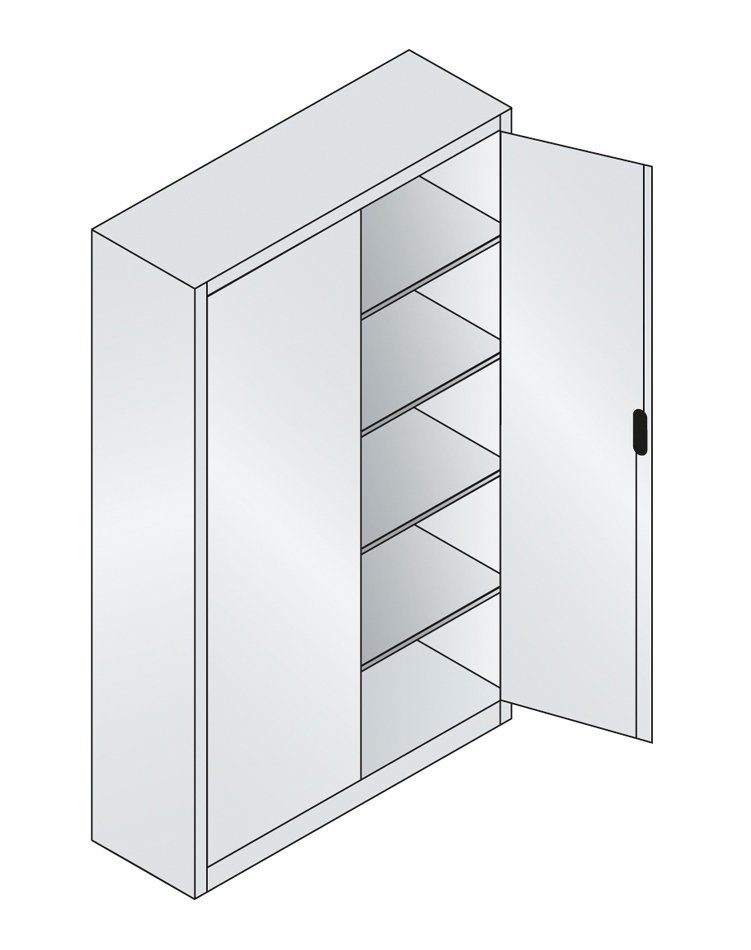Dvoudveřová dílenská skříň, šířka 950, výška 1950, hloubka 600 mm, 2 police. Možnost náhrady plných dveří dveřmi se skleněnou nebo drátěnou výplní. Barva korpusu RAL 7035 světle šedá.