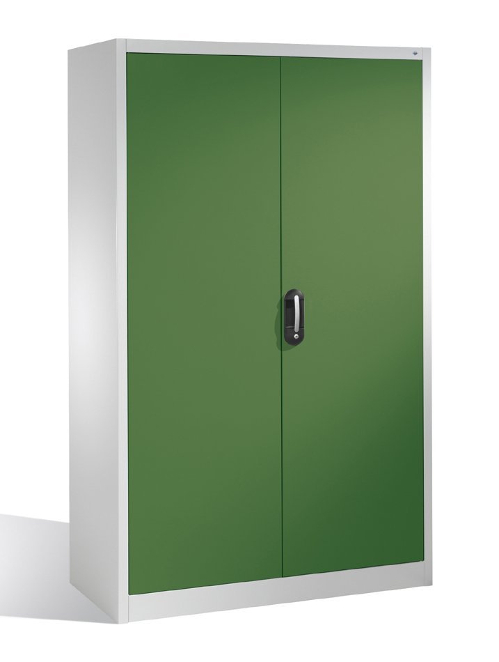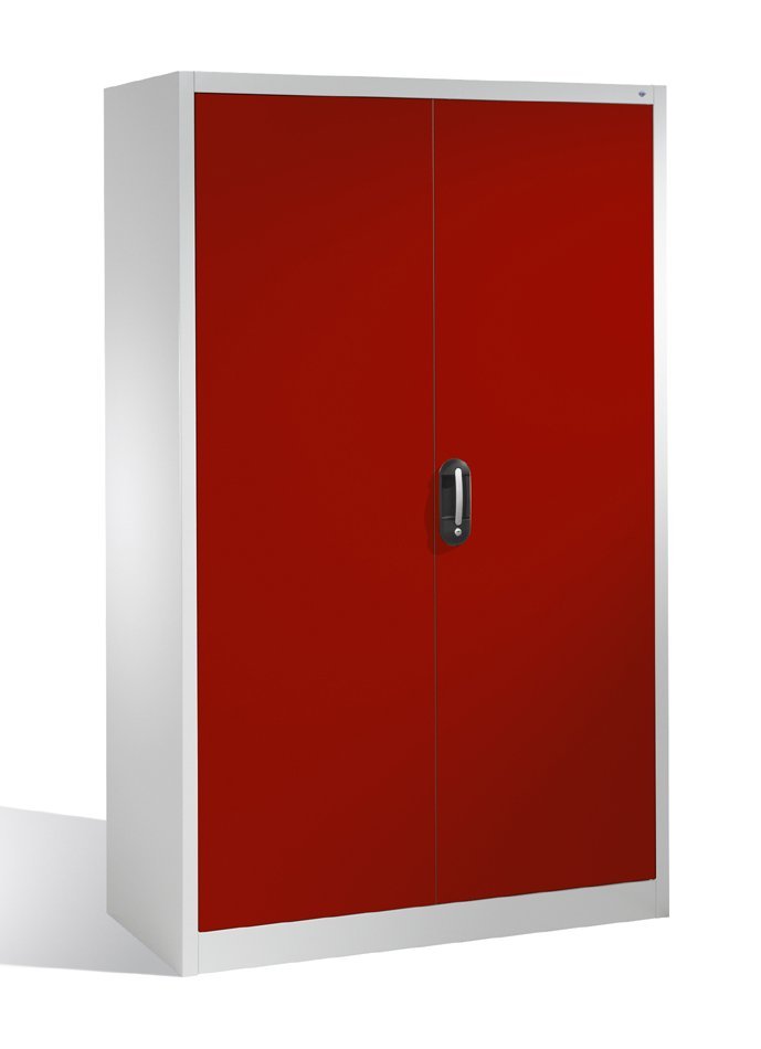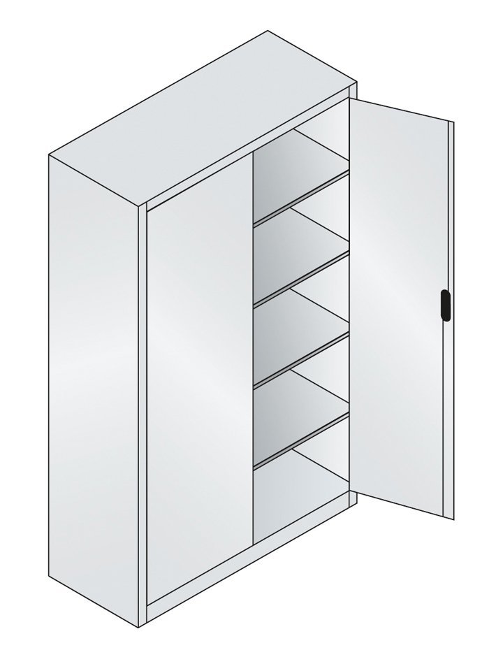 Dvoudveřová dílenská skříň, šířka 950, výška 1950, hloubka 600 mm, 2 police. Možnost náhrady plných dveří dveřmi se skleněnou nebo drátěnou výplní. Barva korpusu RAL 7035 světle šedá.