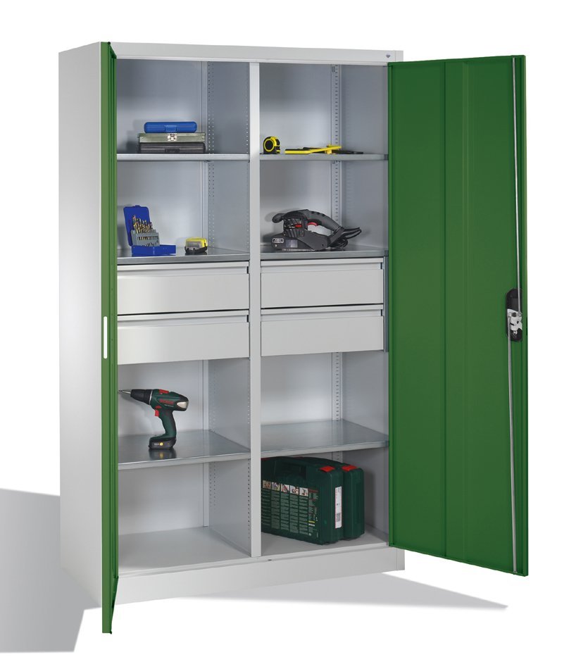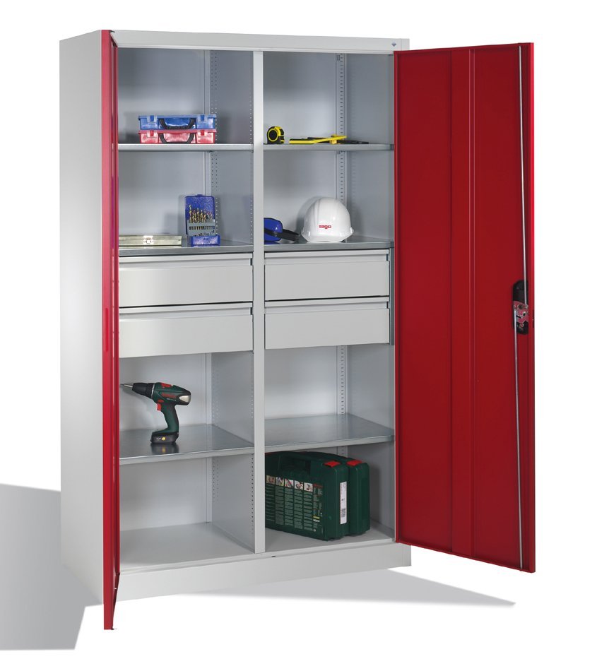 Dvoudveřová dílenská skříň, šířka 950, výška 1950, hloubka 600 mm, 1 police, 8 zásuvek. Možnost náhrady plných dveří dveřmi se skleněnou nebo drátěnou výplní. Barva korpusu RAL 7035 světle šedá.
