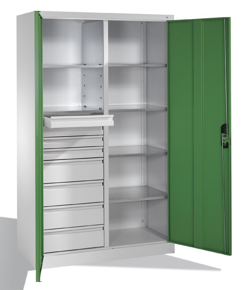 Dvoudveřová dílenská skříň, šířka 950, výška 1950, hloubka 600 mm, 1 police, 8 zásuvek. Možnost náhrady plných dveří dveřmi se skleněnou nebo drátěnou výplní. Barva korpusu RAL 7035 světle šedá.