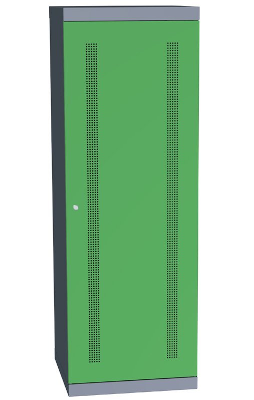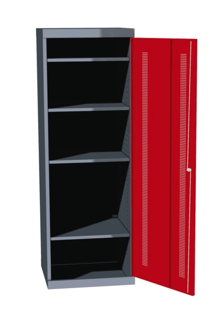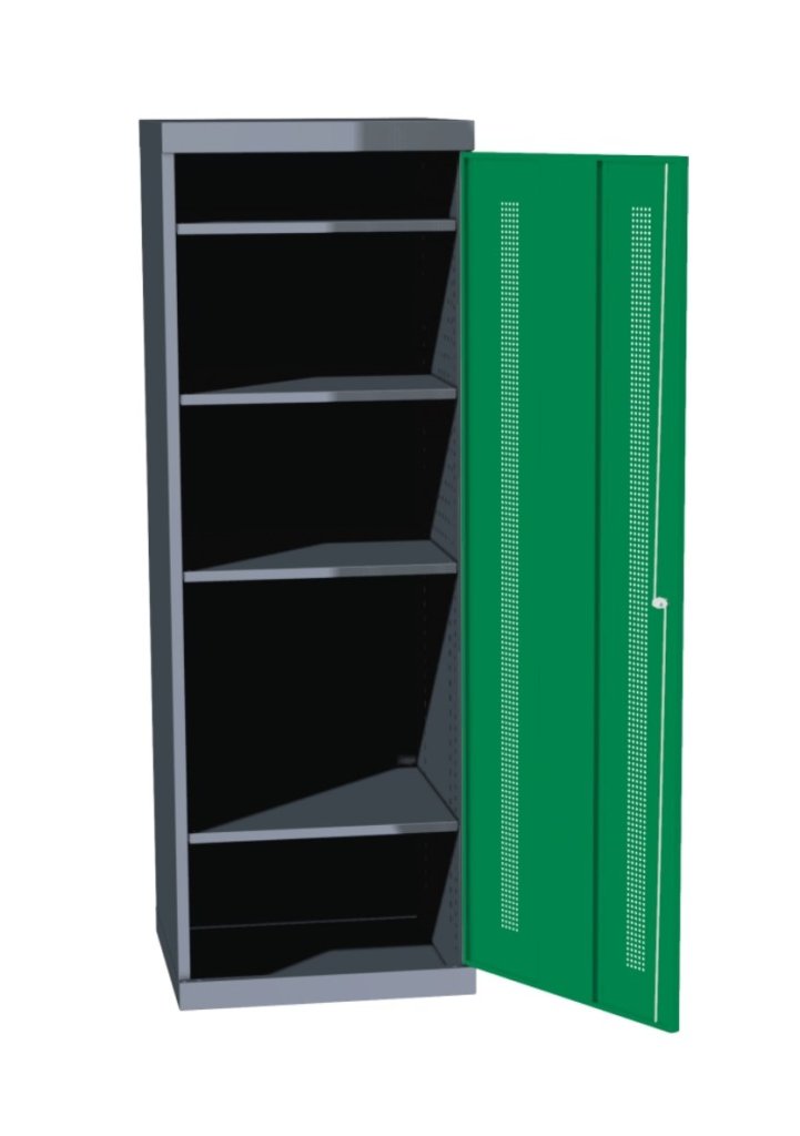 Dílenská skříň Economy jednodveřová. Výška 1800 x šířka 620 x hloubka 600 mm, 4 stavitelné police. Barva korpusu šedá RAL 7031, barva dveří zelená RAL 6001, modrá RAL 5012, červená RAL 3000 nebo žlutá RAL 1023.