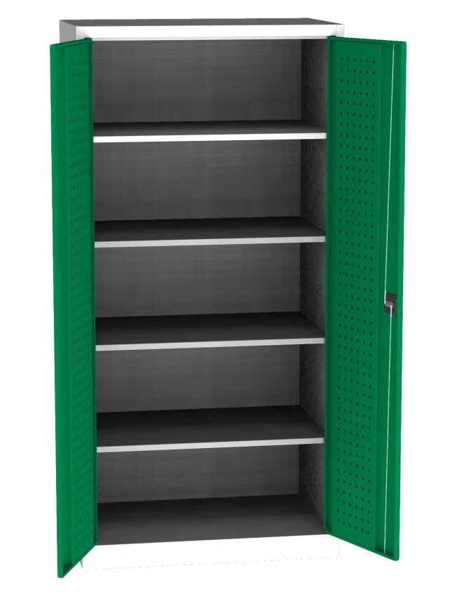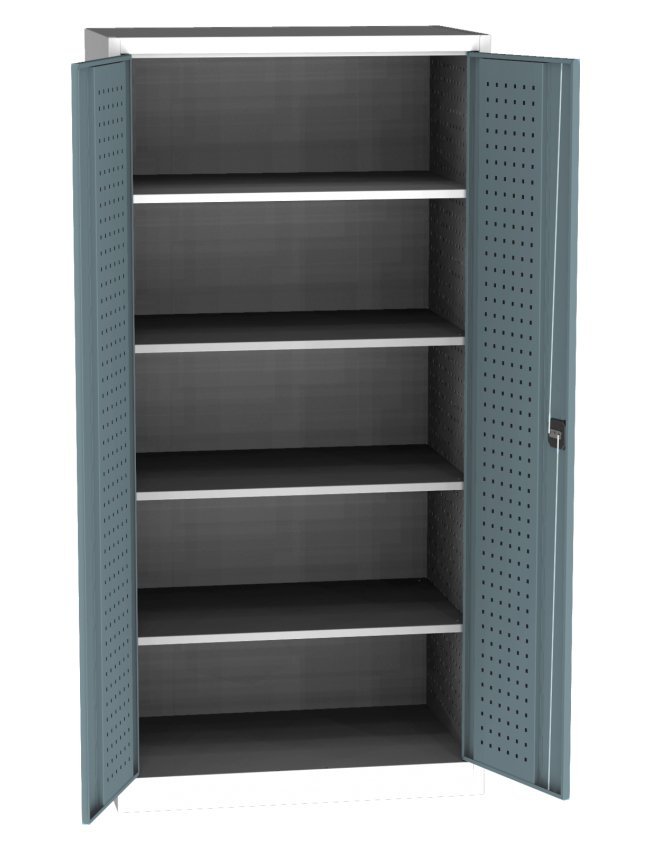 Dvoudveřová dílenská skříň, šířka 950, výška 1950, hloubka 600 mm, 4 police. Možnost náhrady plných dveří dveřmi se skleněnou nebo drátěnou výplní. Barva korpusu šedá RAL 7035. Skladem v barvě dveří modrá RAL 5012.