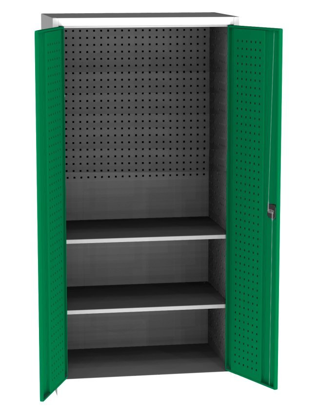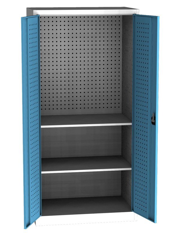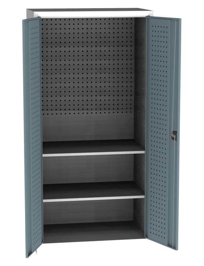 Dvoudveřová dílenská skříň, šířka 950, výška 1950, hloubka 600 mm, 2 police. Možnost náhrady plných dveří dveřmi se skleněnou nebo drátěnou výplní. Barva korpusu RAL 7035 světle šedá.