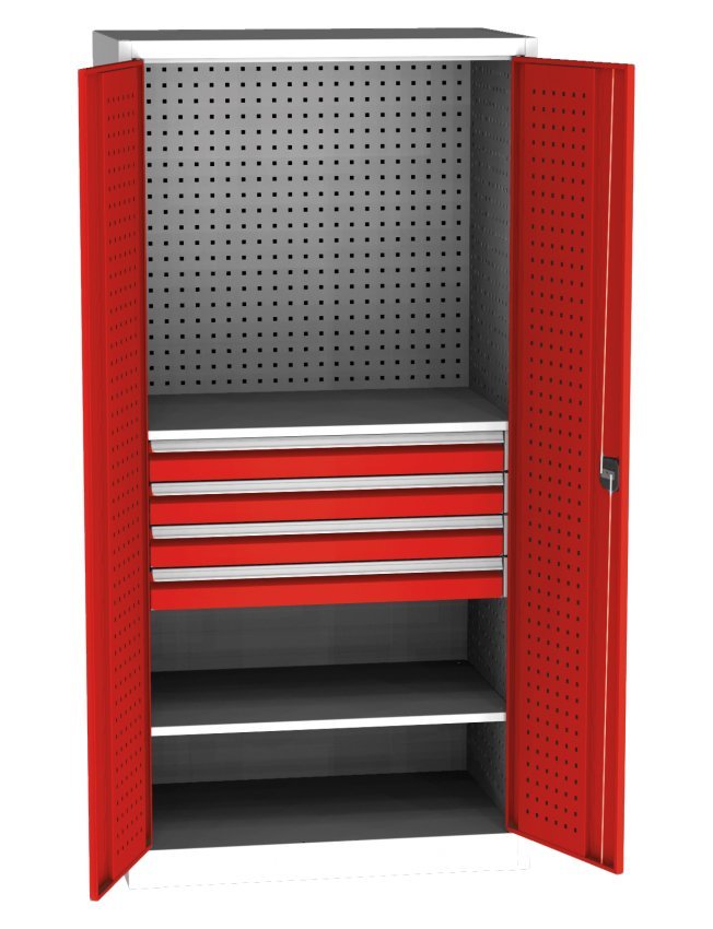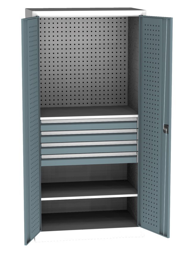 Dvoudveřová dílenská skříň, šířka 950, výška 1950, hloubka 600 mm, 2 police, 4 zásuvky. Možnost náhrady plných dveří dveřmi se skleněnou nebo drátěnou výplní. Barva korpusu šedá RAL 7035. Skladem v barvě dveří modrá RAL 5012.