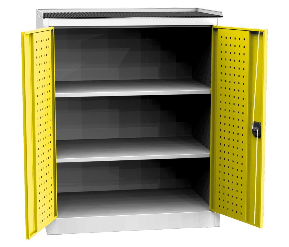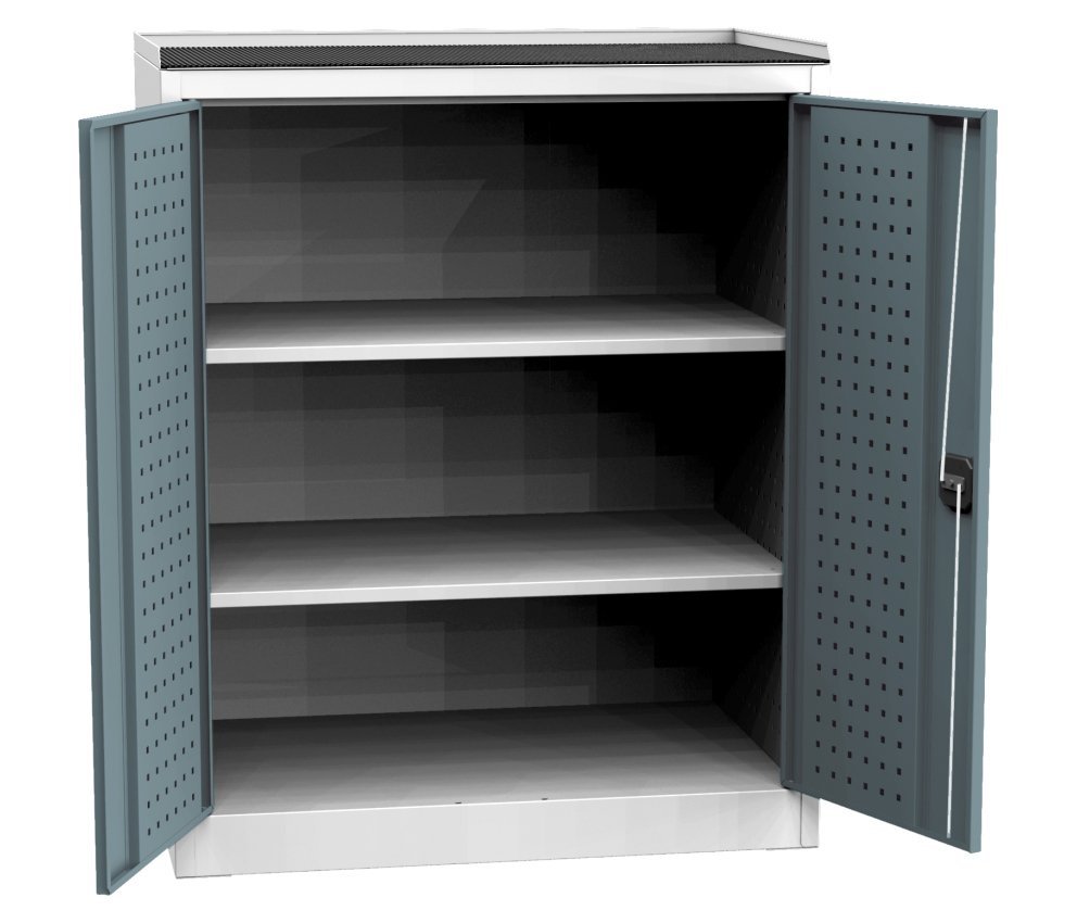 Dvoudveřová dílenská skříň, šířka 950, výška 1180, hloubka 600 mm, 2 police. Možnost náhrady plných dveří rámem s tvrzeným sklem nebo drátěnou mříží pro lepší přehled o obsahu skříně. Nosnost korpusu 800 kg, nosnost police 100 kg. Barva korpusu RAL 7035 světle šedá. Skladem v provedení plné dveře, barva dveří modrá RAL 5012.