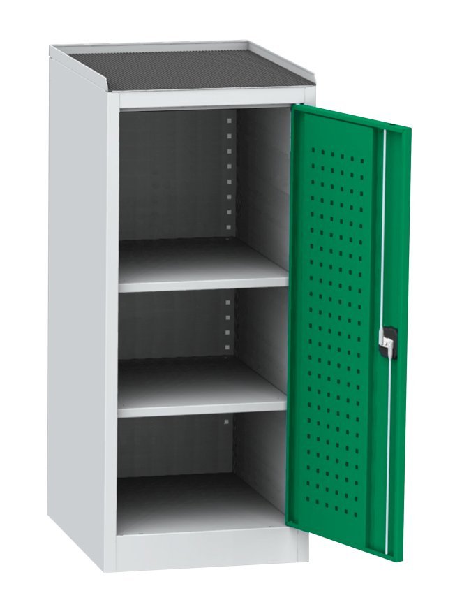 Jednodveřová dílenská skříň, šířka 505, výška 1180, hloubka 600 mm, 2 police. Možnost náhrady plných dveří rámem s tvrzeným sklem nebo drátěnou mříží pro lepší přehled o obsahu skříně. Nosnost korpusu 800 kg, nosnost police 100 kg. Barva korpusu RAL 7035 světle šedá.