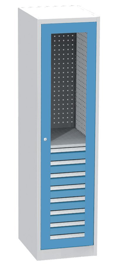 Jednodveřová dílenská skříň se skleněnými dveřmi v ocelovém rámu, šířka 505, výška 1950, hloubka 600 mm, 1 police, 8 zásuvek. Nosnost korpusu 800 kg, nosnost police 100 kg, nosnost zásuvky 50 kg. Barva korpusu RAL 7035 světle šedá.