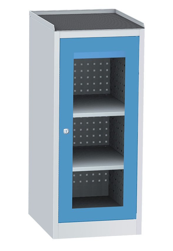 Dvoudveřová dílenská skříň se skleněnými dveřmi v ocelovém rámu, šířka 505, výška 1180, hloubka 600 mm, 2 police, 1 zásuvka. Nosnost korpusu 800 kg, nosnost zásuvky 50 kg, nosnost police 100 kg. Barva korpusu RAL 7035 světle šedá.