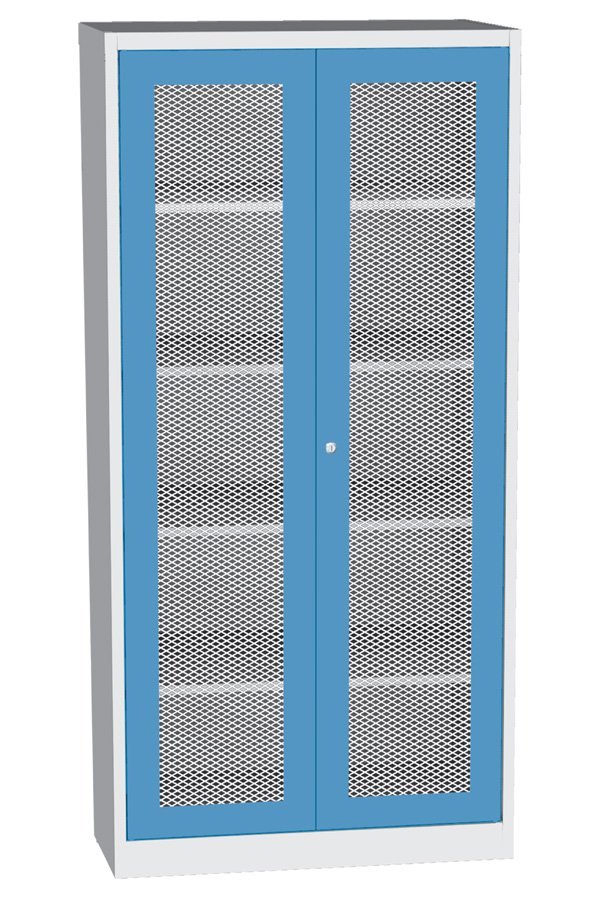 Dvoudveřová dílenská skříň s drátěnými dveřmi v ocelovém rámu, šířka 950, výška 1950, hloubka 600 mm, 4 police. Nosnost korpusu 800 kg, nosnost police 100 kg. Barva korpusu RAL 7035 světle šedá.