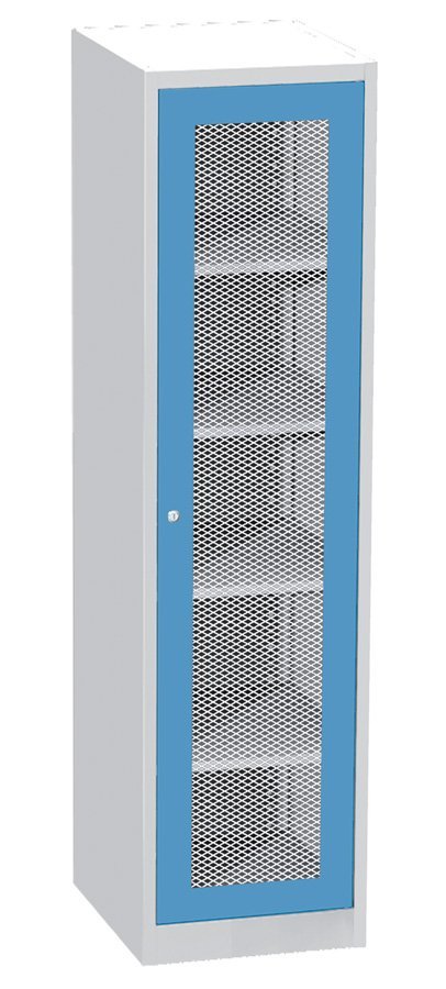 Jednodveřová dílenská skříň s drátěnými dveřmi v ocelovém rámu, šířka 505, výška 1950, hloubka 600 mm, 4 police. Nosnost korpusu 800 kg, nosnost police 100 kg. Barva korpusu RAL 7035 světle šedá.