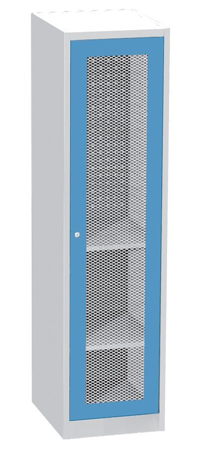 Jednodveřová dílenská skříň s drátěnými dveřmi v ocelovém rámu, šířka 505, výška 1950, hloubka 600 mm, 2 police. Nosnost korpusu 800 kg, nosnost police 100 kg. Barva korpusu RAL 7035 světle šedá.